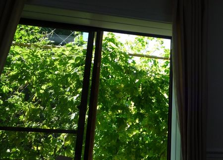 会社の北西窓より。温熱的には意味無い開口だけど、太陽を背にする分、上手く取り込めば窓が上質な額縁に。