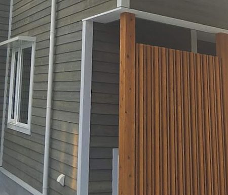 木を外壁として使う際、出隅(角)は外壁と同色にしても良いのですが、あえてホワイトをアクセントとして使うと、全体的にちょっとだけカジュアルに映ります。