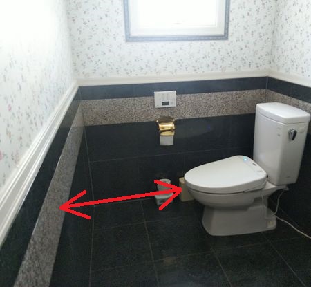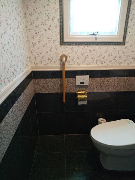 既存トイレ、前の壁までが少し遠くて立ち上がるのがキツイとお母様。