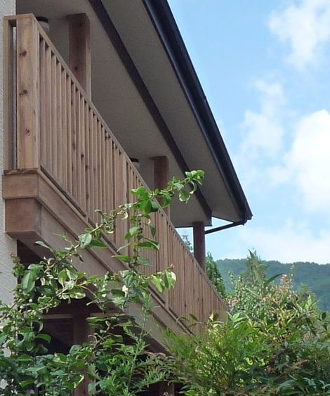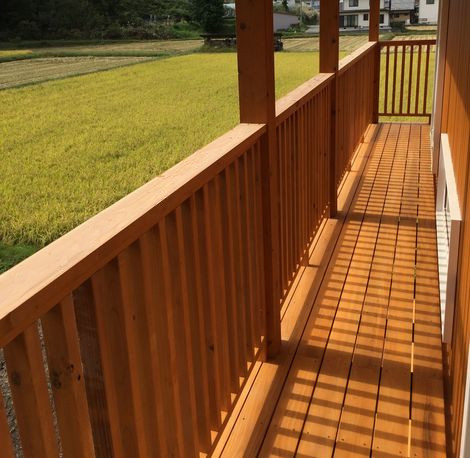 バルコニーを屋根付きの木製スノコとする事で、防水メンテナンスを不要として 耐候性を上げ 通風を誘いますが、さらに手摺壁の仕上げ分も無くなるので、その分奥行が増える事に。