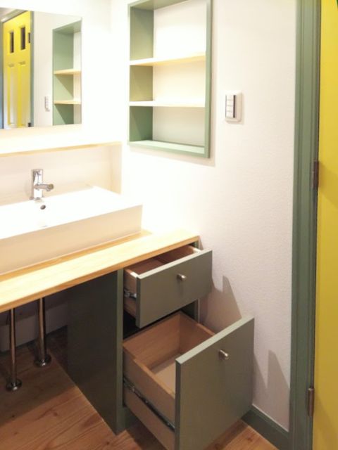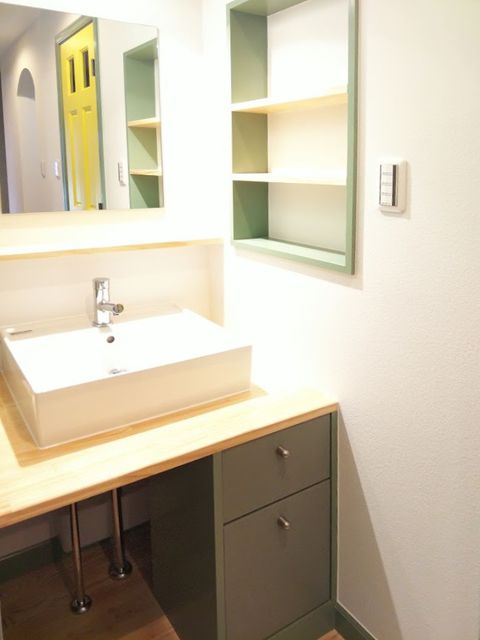 はい。出来るだけ洗面台は脱衣室から外す様にしていますが、こちらトイレの隣の廊下になりまして、木製カウンターに陶器のボウルを乗せています。