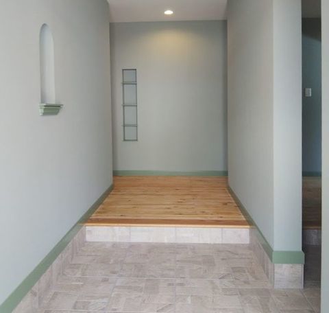 ブルーグレーの木製外壁に漆喰をコーディネート。