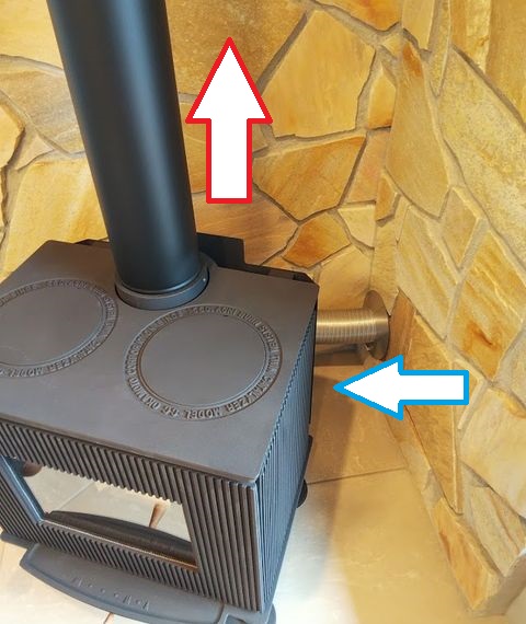 こちらも欧米のストーブ同様 外部から吸気した空気を使って燃焼し、燃焼後の煙は煙突から外部に排気されます( ↓ 青い矢印の上に見えるステンレスの筒がそれ)
