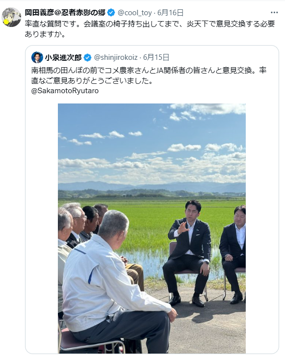 率直な質問です。会議室の椅子持ち出してまで、炎天下で意見交換する必要ありますか。