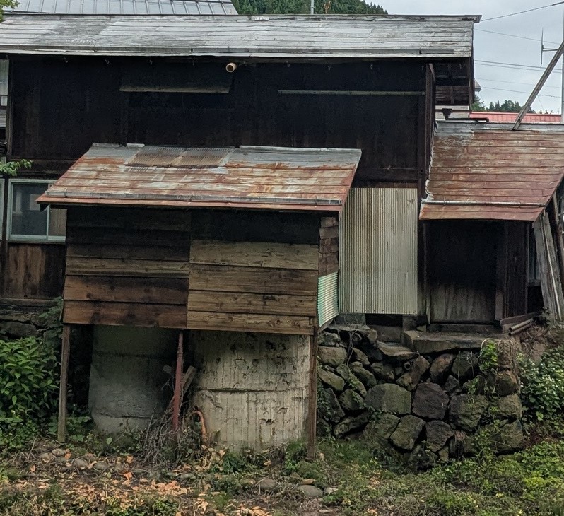 この小屋壊してカーポートをとのオファー。裏に回るとポロポーションの良さに気づく。これ下屋とか減築して、このままの雰囲気で車庫+倉庫にリノベした方が良いのでは。段差生かして浮遊空間とか出来れば車庫以外の使い方も(腕ぶん回してる)