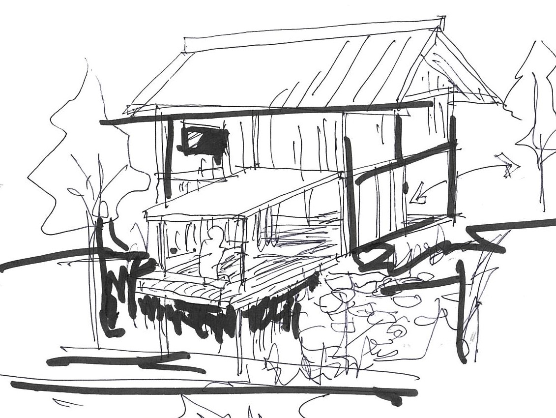 ↑ 裏の崖側に浮遊デッキつけて 雨の日は車出して車庫の中でBBQとか。