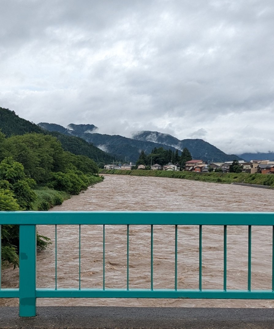 会社前の宮川 台風でも無い6月にこの量は珍しい
