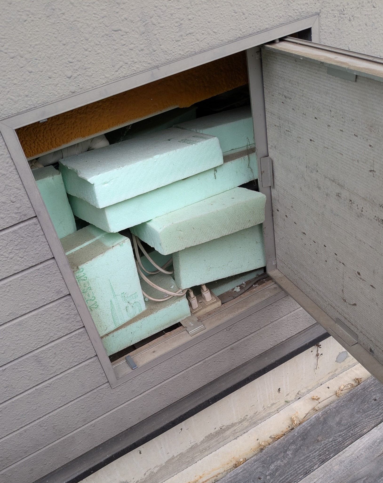 リモデル現調。ユニットバス外壁側に点検口あったのでラッキー♡と覗いてみれば、ちゃんと断熱施工してあったww