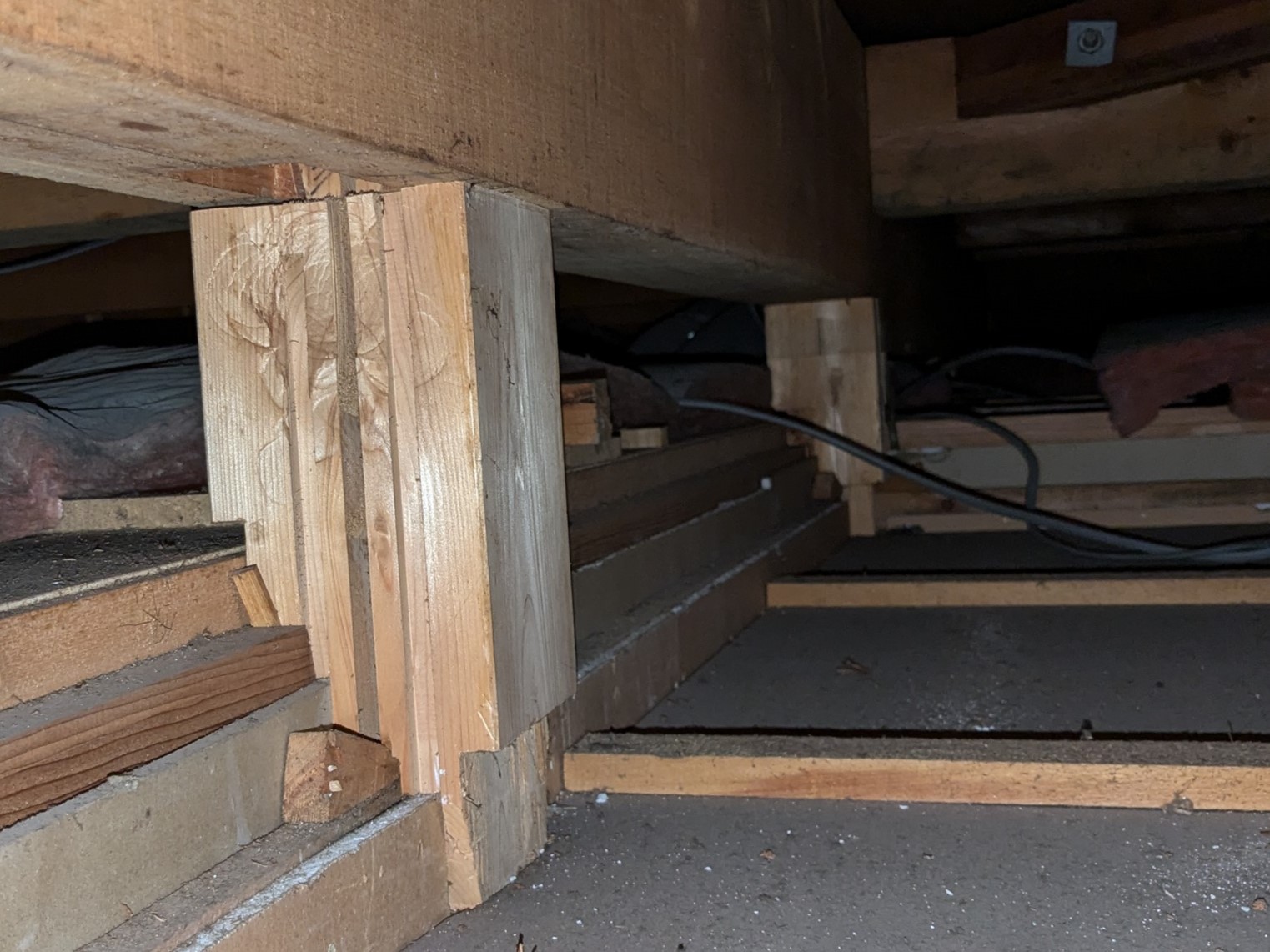 現調にて小屋裏チェック。何度も叩いた跡あるんだけど雄ホゾが無い・・なかなかに謎だ。