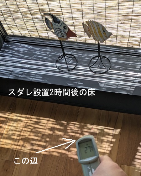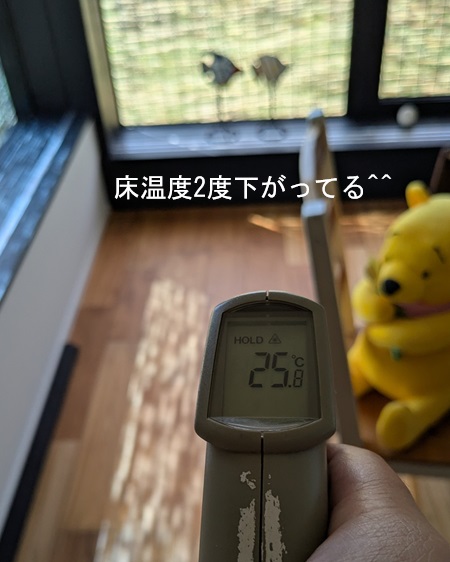 で、上の画像は設置した日の画像ですが、これの効用としては「朝の日射を入れない」事が大前提で、次の日、朝から30度超えの日でも、床温度は日射を入れた時と比べ「2度」以上下がっています。