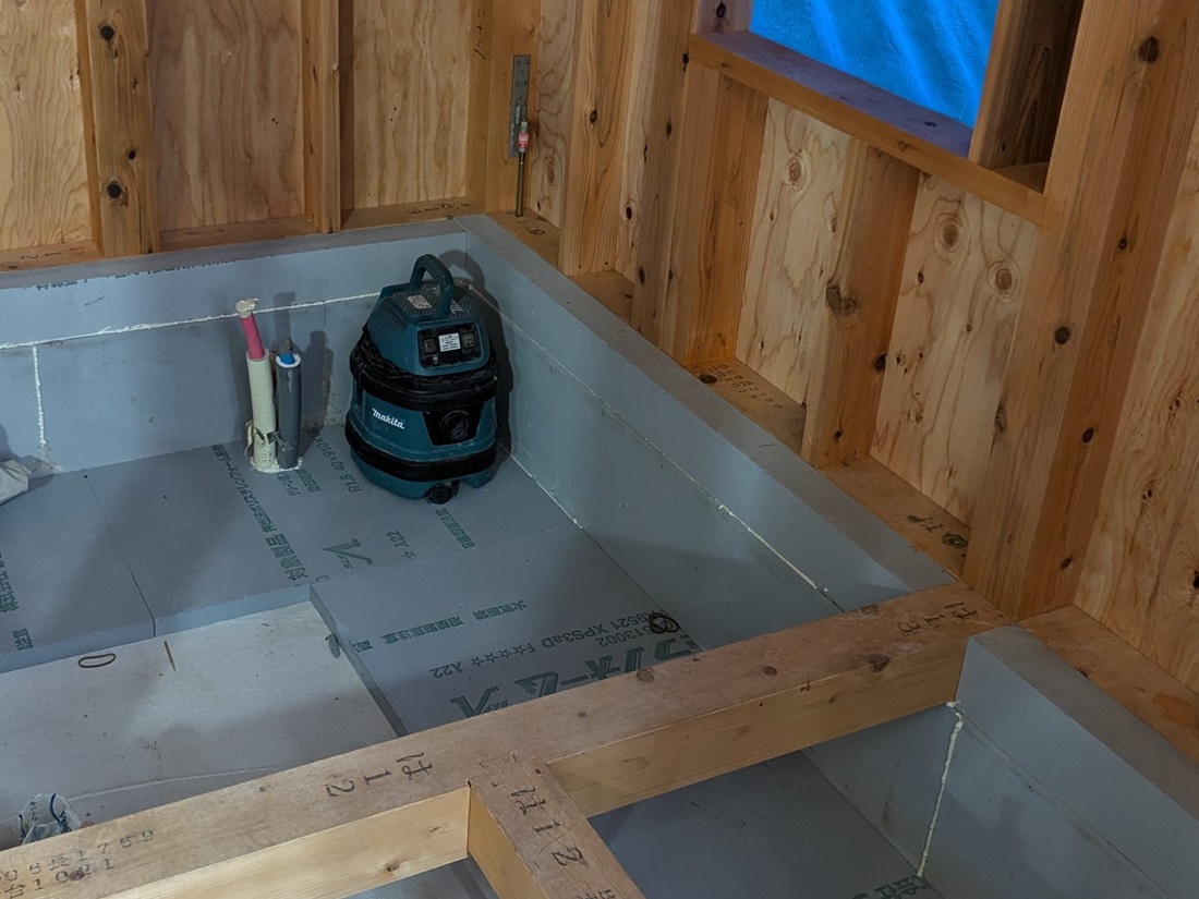 外張り付加断熱でも、シロアリチェックの為に熱ロスになりがちな土台内側に 押出法ポリ100mmを施工することでR=4.5以上、接手と配管部は防蟻シールしてから床合板施工。外気に接しない柱回りも気密処理にて、管理できない壁体内通気を抑制。