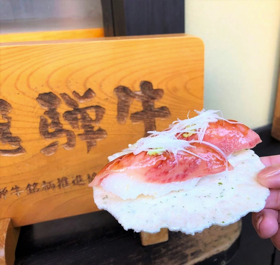 食べ歩きの定番になりつつある「飛騨牛にぎり」せんべいの上に飛騨牛のお寿司。全部食べられるのでゴミ出ない。これ考えた人天才でしょ。