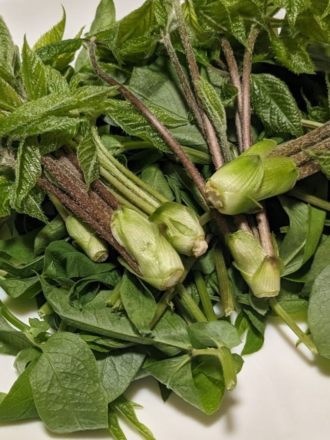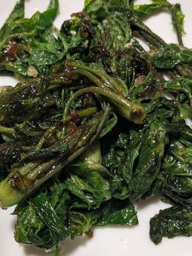 現場近くの山からコンテツ(コシアブラ)とアズキナ。天ぷらと思わせて醤油とごま油で炒めて片栗粉でとろみを。うまうま。