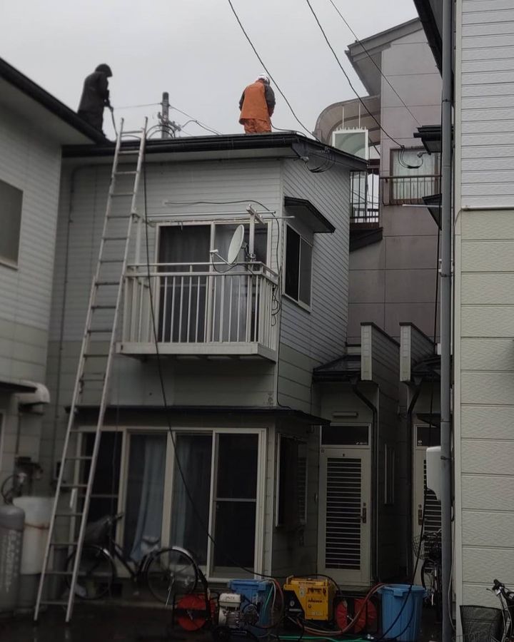 賃貸4件屋根塗装。本日雨天で洗浄作業には最適。ツイテルツイテル。