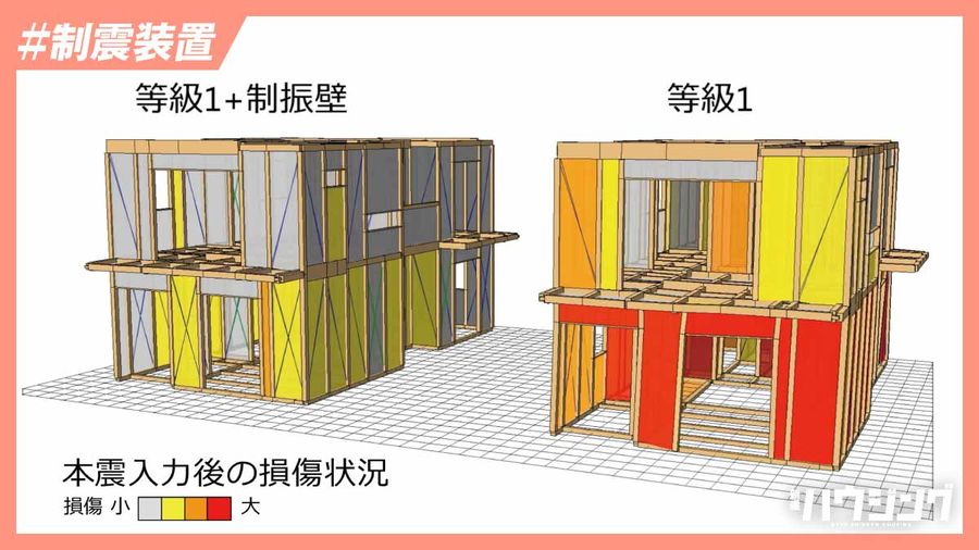 右が制震装置×4ヶ所 左が制震無し(双方耐震等級1)