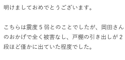 地震時うちのオーナーさん宅は大丈夫だから、まずは家の中に居て。家が一番安全で安心。