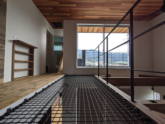 この手のアスレチックネットは床なのか吹き抜けなのか・・この施工例にいたってはネット床に手摺ついてるし、吹き抜けにだけ火打ち入ってるしw