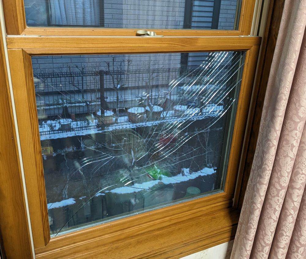 HurdWindowダブルハング3層の内側ガラスたぶん熱割れ。