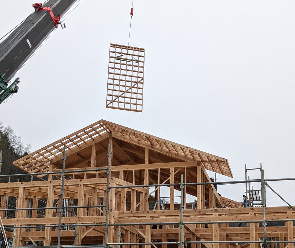 大安吉日棟上げ日和。登り梁+厚物合板で屋根構面つくりーの垂木施工、への字屋根。しかし12月に雪が無い飛騨とか・・有難いw