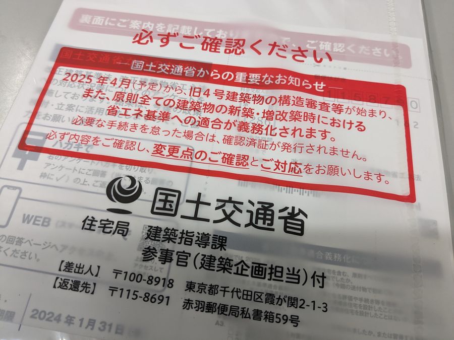 国交省から分厚い資料が届いた。再来年4月から4号廃止と省エネ基準適合義務化。審査機関大変そう・・。