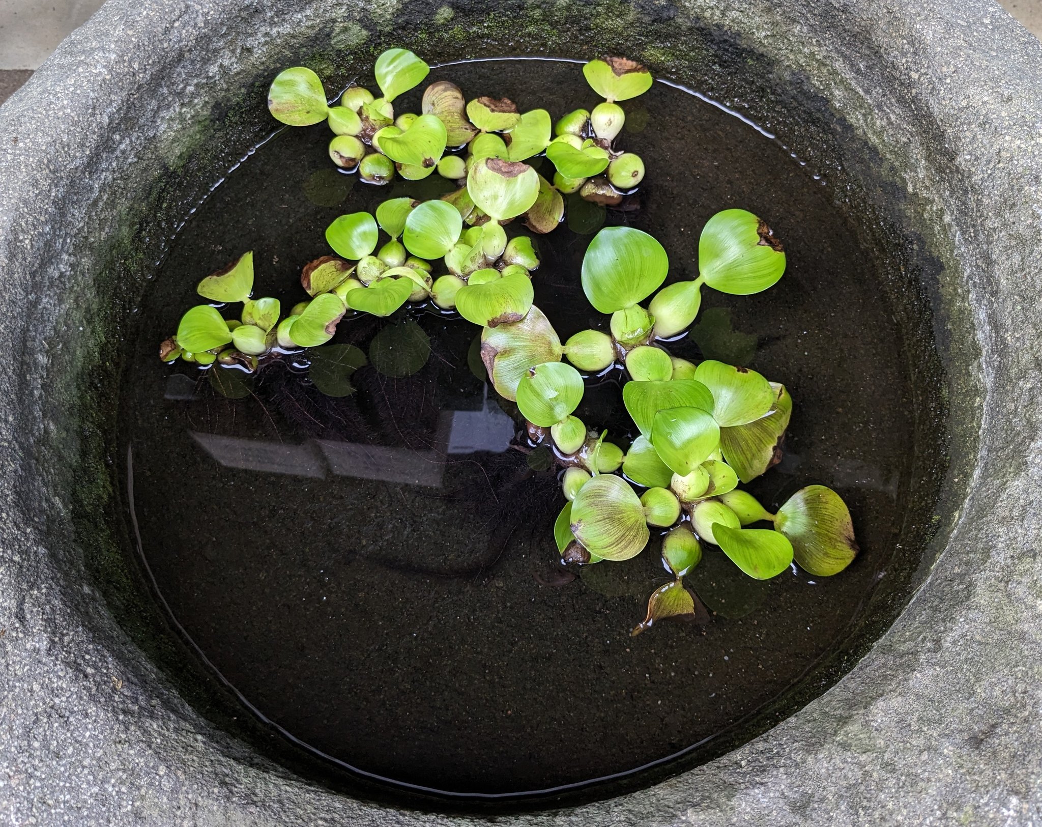 何故かボウフラ湧かない水盤。涼し気で宜しい。