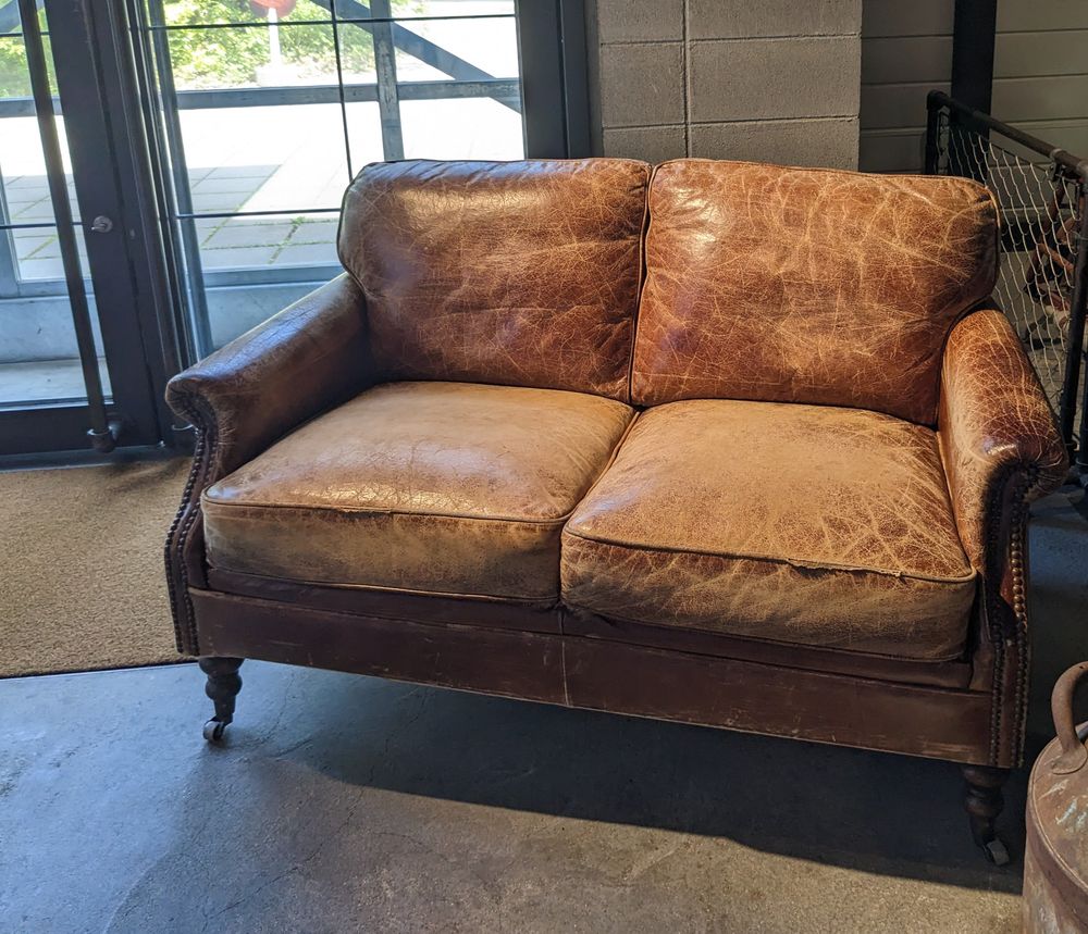 土間に年代モノ皮ソファえもい。ブルックリンとか言いつつビニルクロス貼ってるの恥ずかしく無いか。
