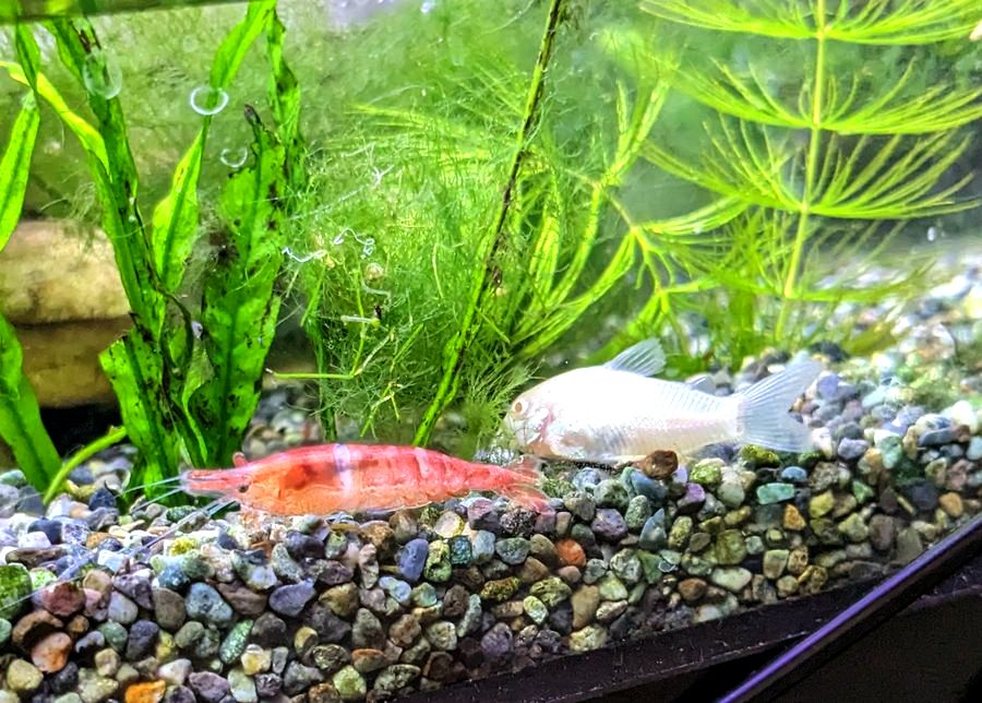 何故か うちのミナミヌマエビちゃんは赤い。