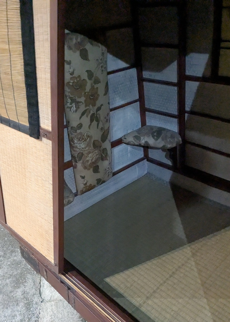 実際の籠って思うより小さい。江戸時代の平均身長155cmとしても小さいような。実際これで移動するのは正座か体育座り・・どっちにしても中々でありんす。