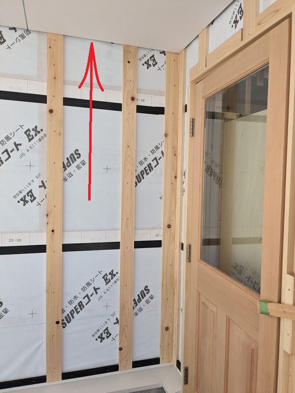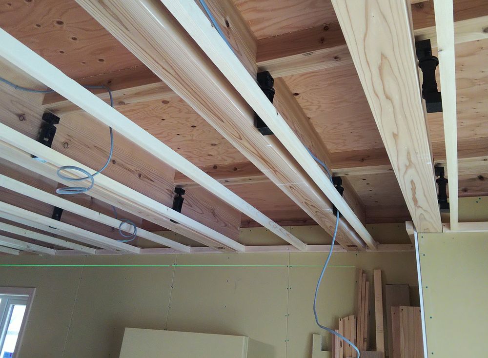天井貼る前に桁までプラスターボードが伸びているかチェック(防湿シート押さえ)からの防振吊木。