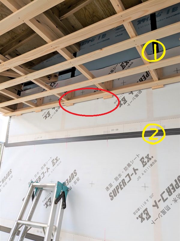 ②が透湿防水シートを留めている防水気密テープ。