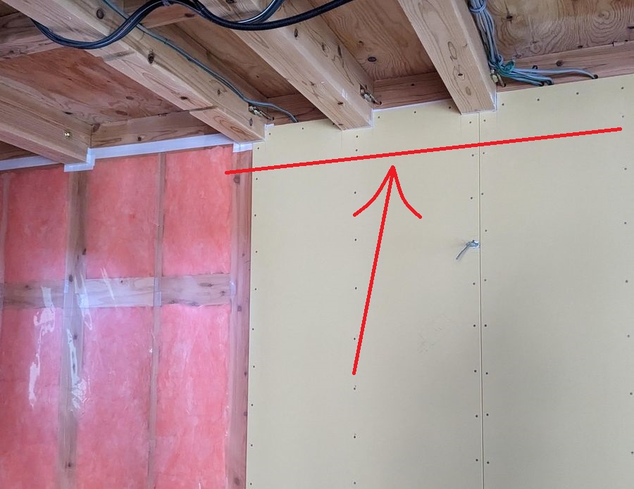 防湿シートは丁寧に梁と圧着。ちなココの天井ラインはこの辺
