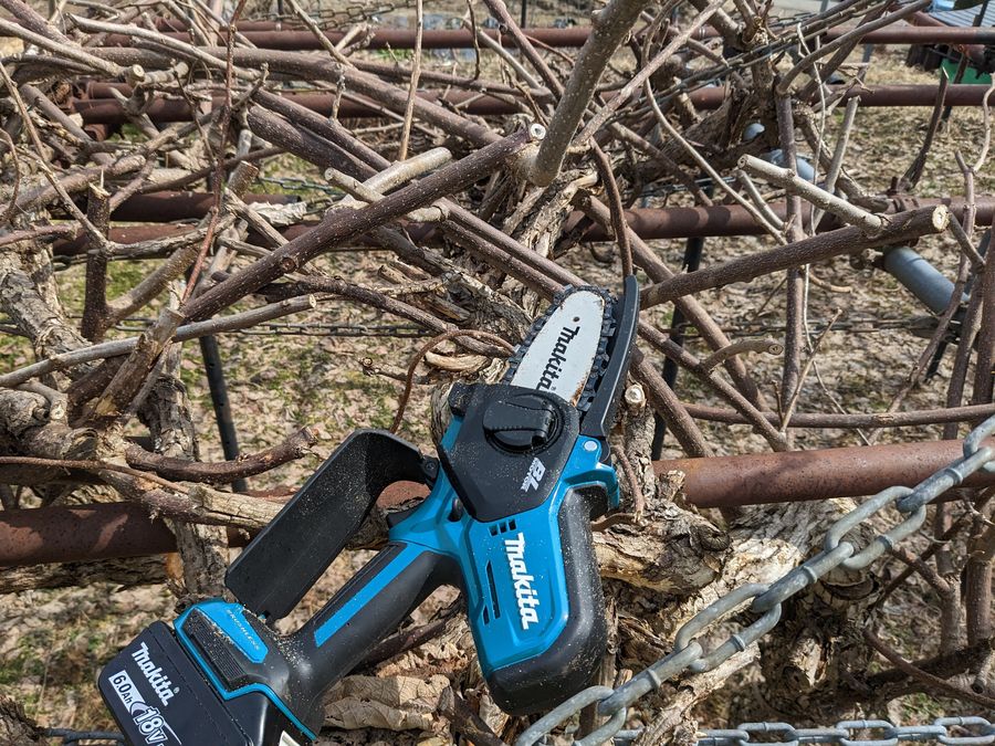 お兄さんは電動チェンソーと言うオモチャを手に入れ、地上2.5mにてキウイ棚のトリミングw