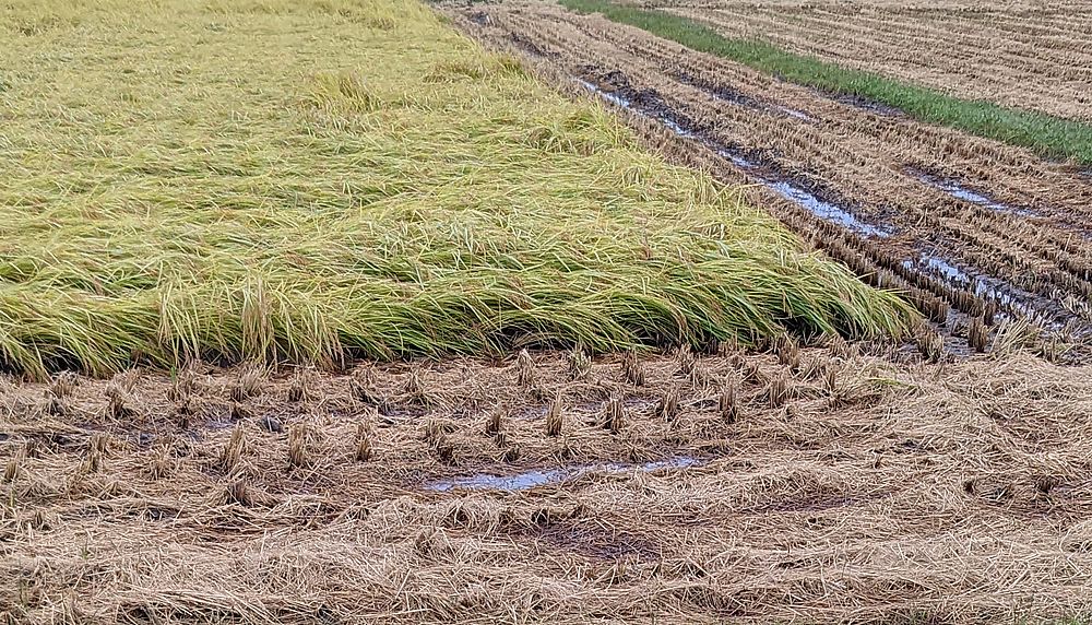 こんなに水ついてて、台風で倒れてる田んぼにコンバイン入れるの 心折れるだろうなぁ(涙