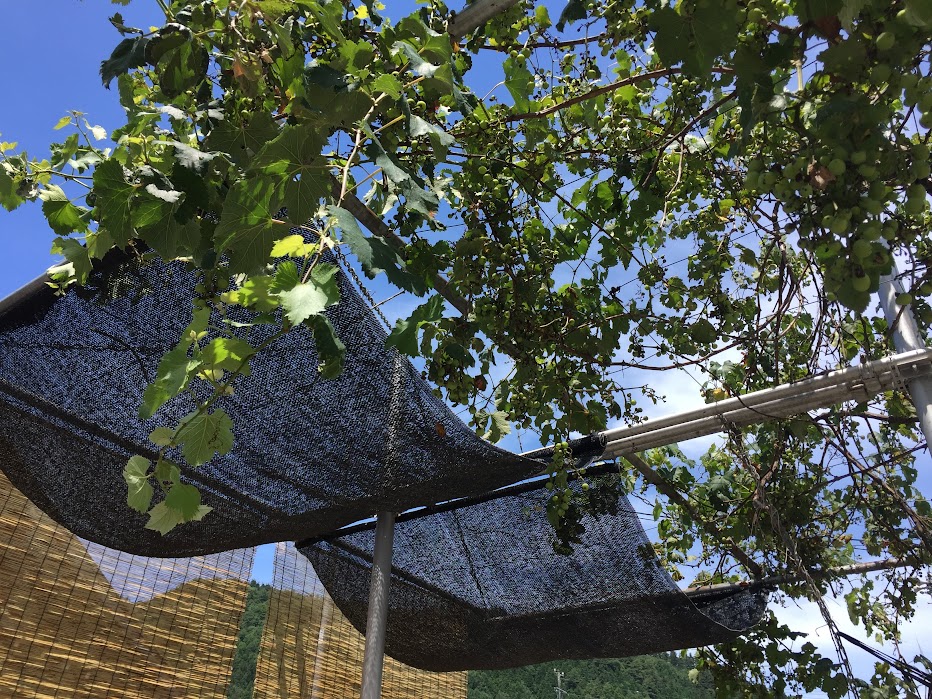 葡萄棚の日陰がイマイチなので、寒冷紗とスダレ掛けてみる。すずしげいん^^