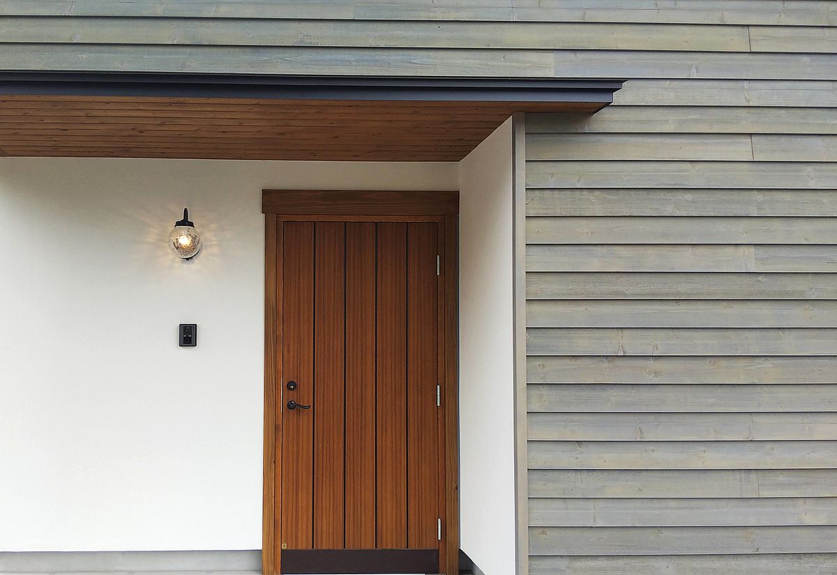 何はさておき 漆喰と木製玄関ドアの相性は良い。
