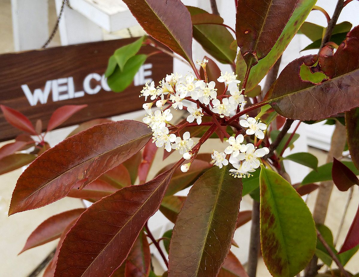 事務所前のレッドロビンに花咲いてた。かわいい。