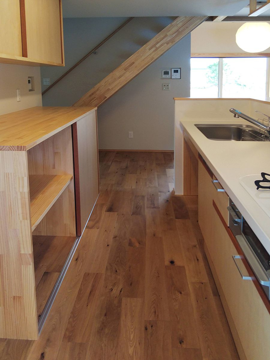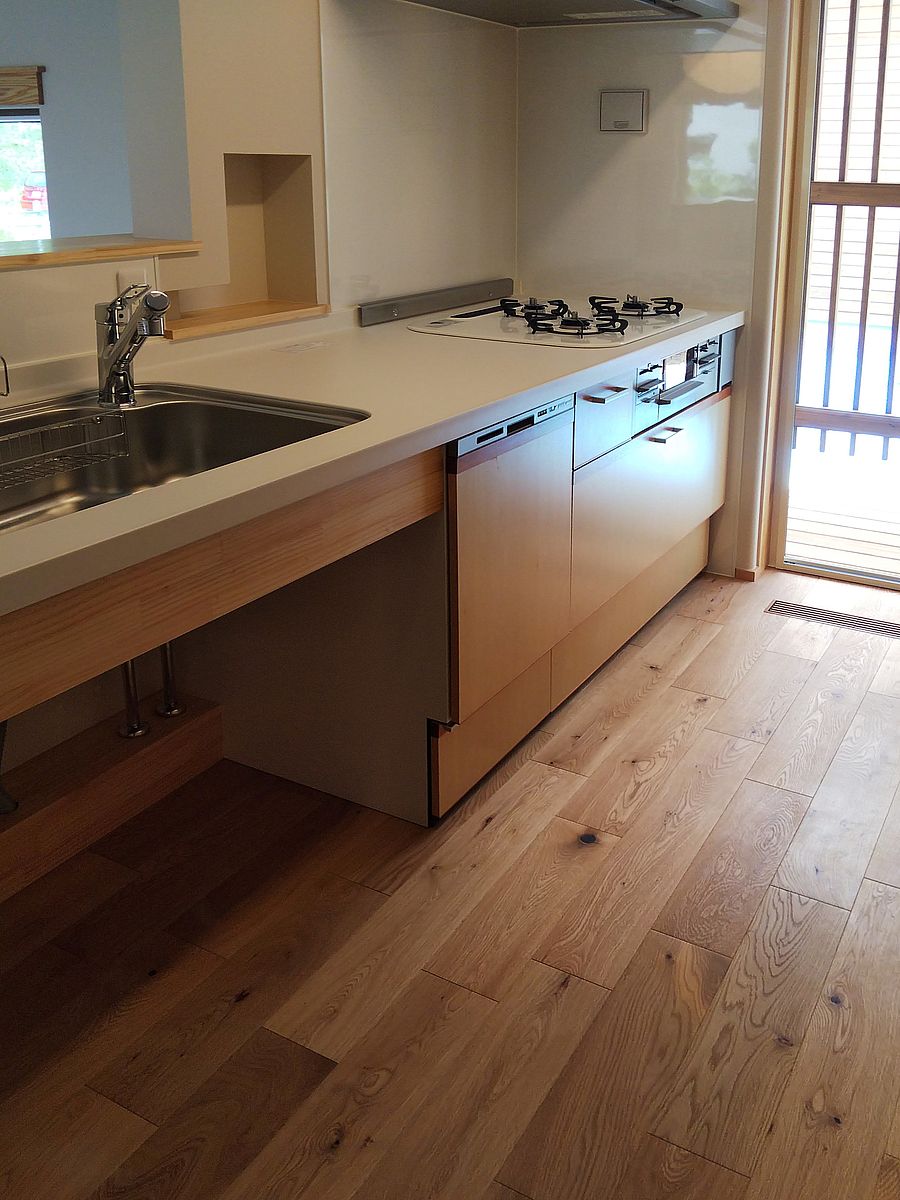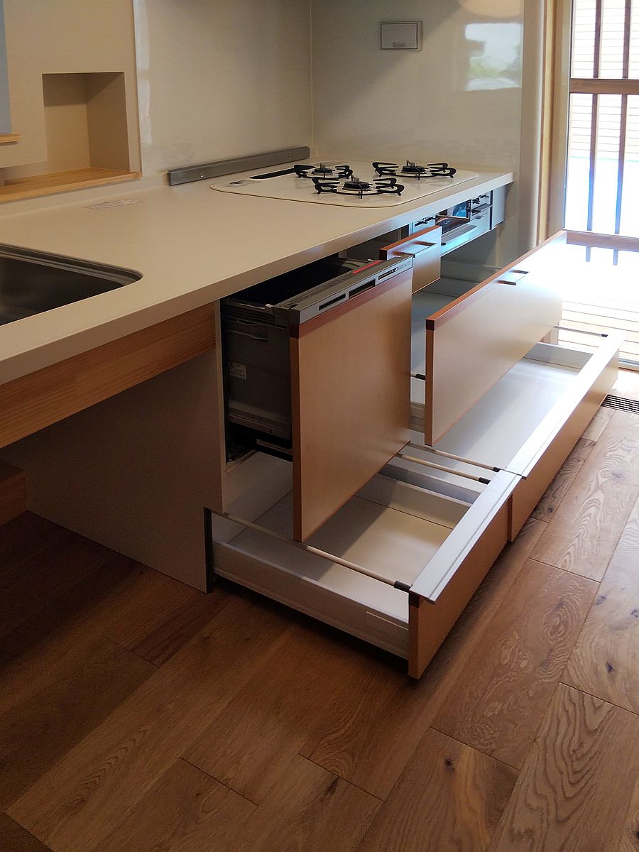 オリジナル制作キッチンお引渡し中。引き出しはソフトクローズ。