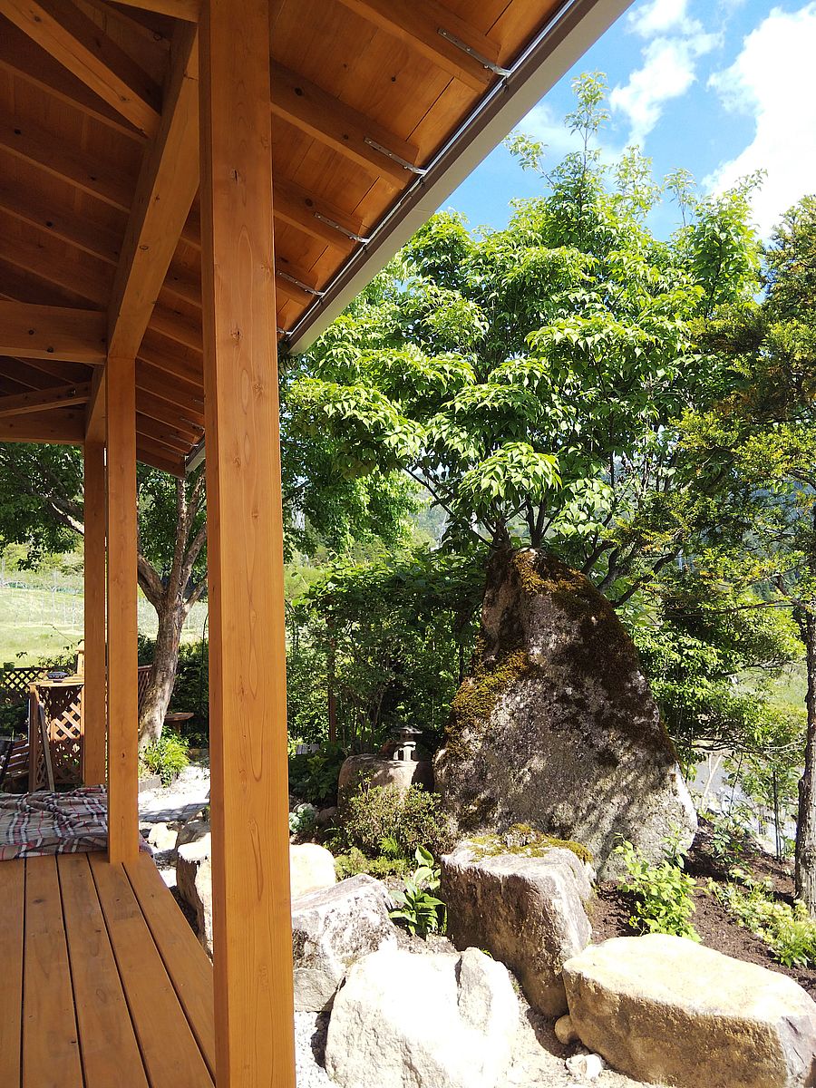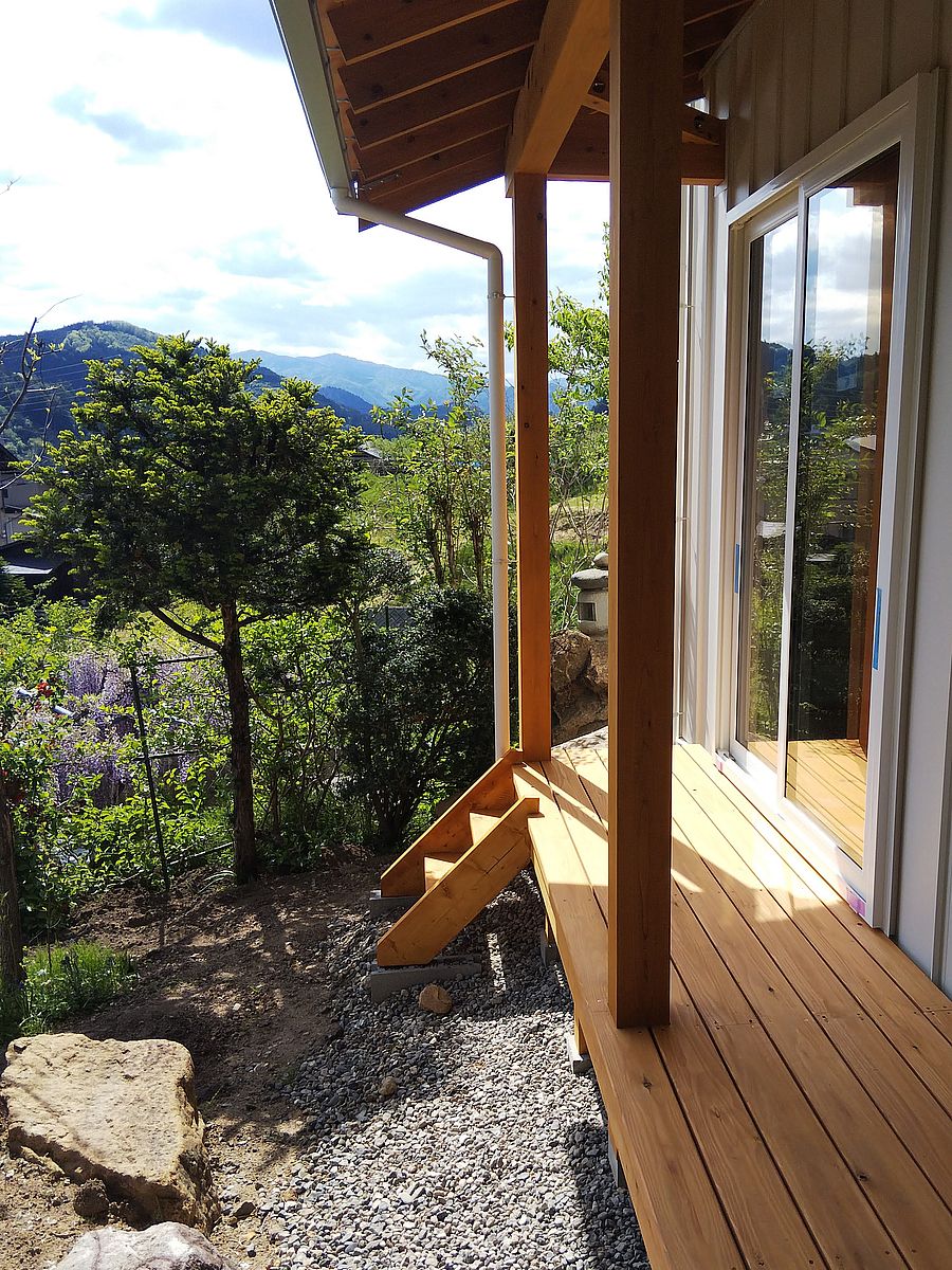お引渡し前の家だけど、既存の庭ちょっと動かしただけで、すっかり馴染んでる感じが良いw デッキもこれ位屋根から控えると、メンテしなくても長持ち^^