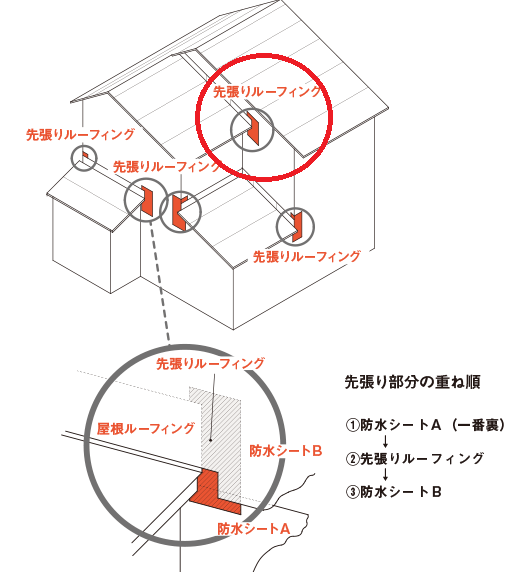 例えば仕上げ前の取り合い部には 先張りのルーフィング(防水)を行い
