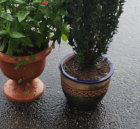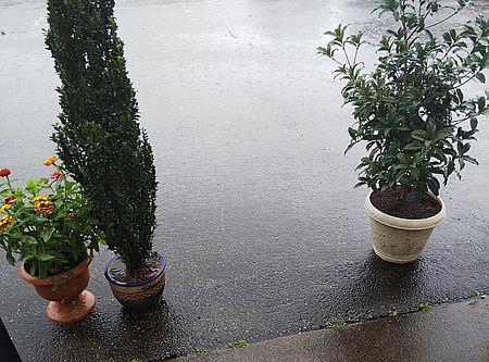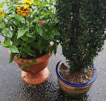 両方同じ土で育てていますが 同じ雨量でも針葉樹の鉢には 処理しきれない雨が溜まってますね。