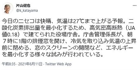 庁舎でUA0.18は意識高くて素敵だけど「朝1階の排煙窓を開け冷気を取り込み、気温の上昇前に閉める」「窓のスクリーンの開閉」と言う手間も素晴らしい。