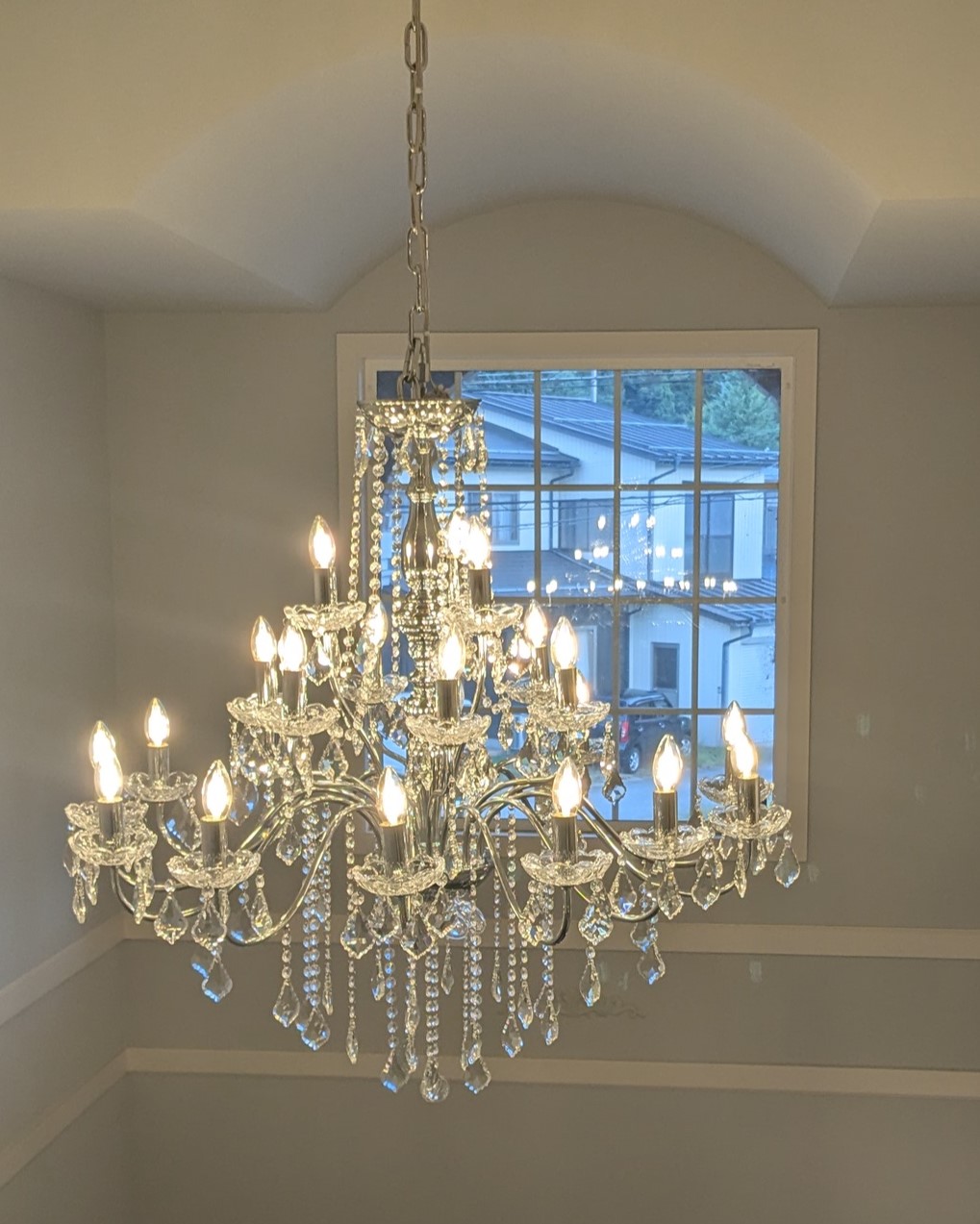もう少し大きいのがいーなーって、築7年でシャンデリア交換。キラッキラだw