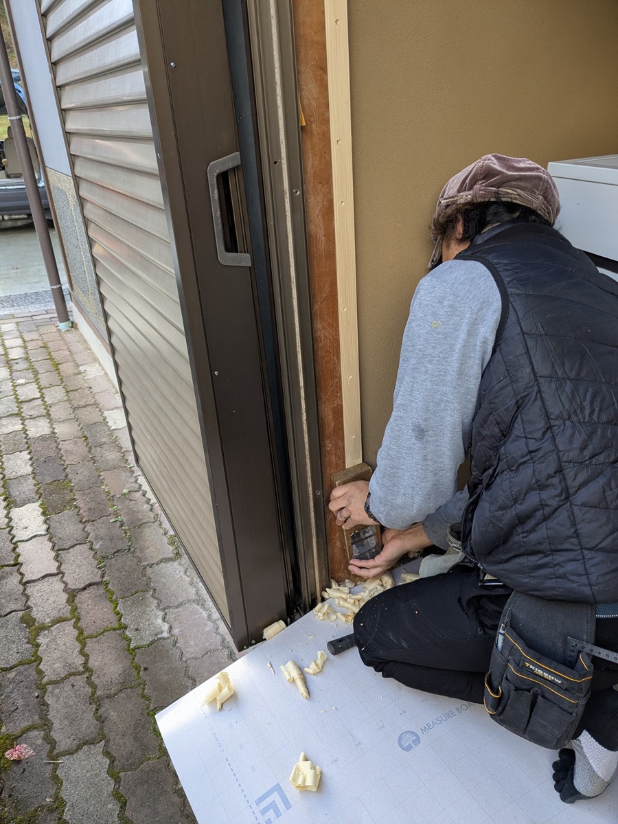 内窓用の窓枠設置。チリが違ったり枠が曲がってたりで現場調整。