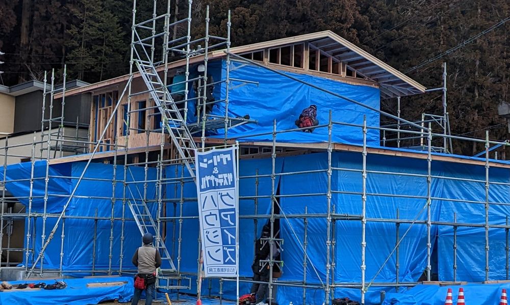 大安吉日棟上げ日和。なんとか屋根仕舞い&シート養生までで本日終了(シートは途中)