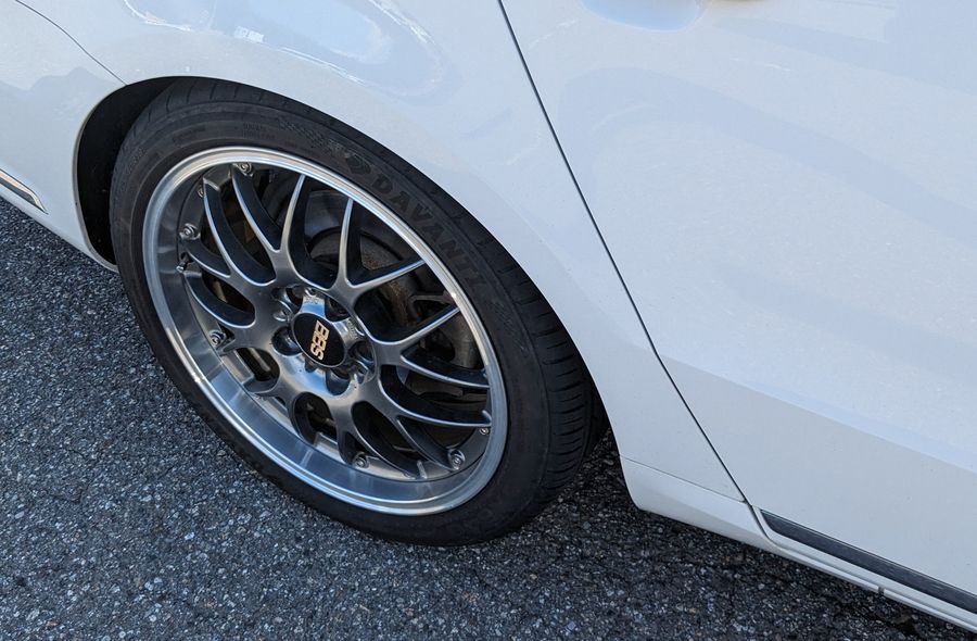ようやくタイヤ交換でツライチ復活。腰痛いので洗車と鉄粉取りは後日。