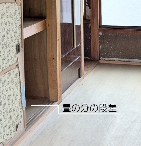 この場合の床は畳下地の上に下地作ってあるので、その分段差ができる訳で、取ってしまって同レベルで床下地作った方がキレイに収まります。