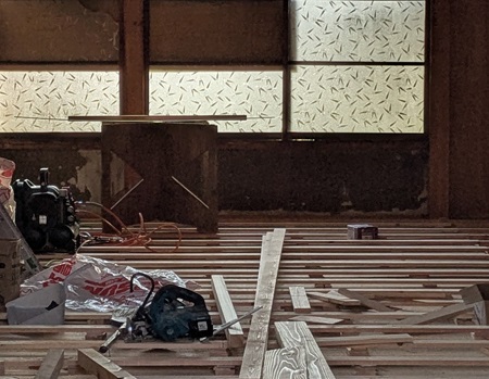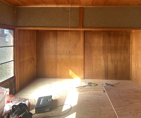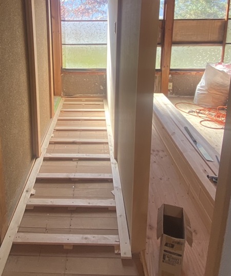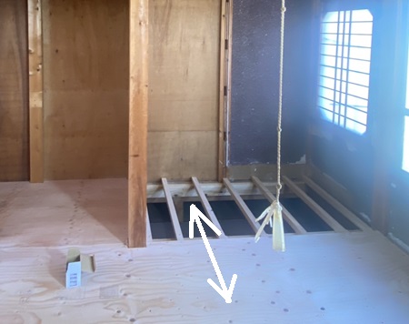 その上から構造用合板を張って、平らに整えてからからフローリング仕上げとなります。