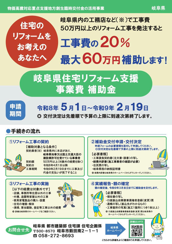 岐阜県からリフォーム補助金出ますよ。