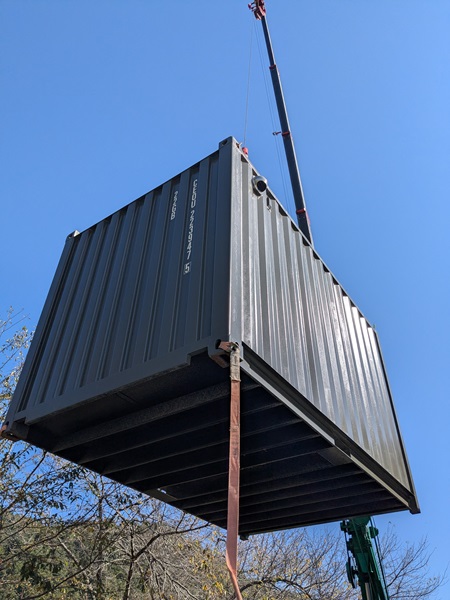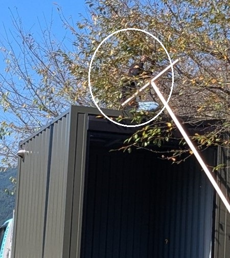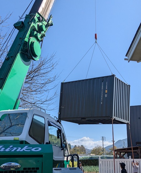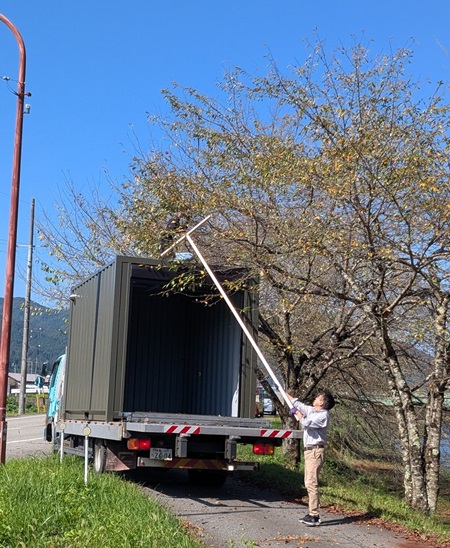 ちょっと見にくいですが、コンテナ上にスタッフ上げて、丁寧に枝を除けていますww