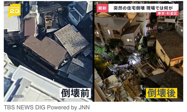 腐食やシロアリ被害等の物理的要因に、トラック等の振動が重なり・・なんて思ったのですが、家ってより擁壁の崩落ですね。